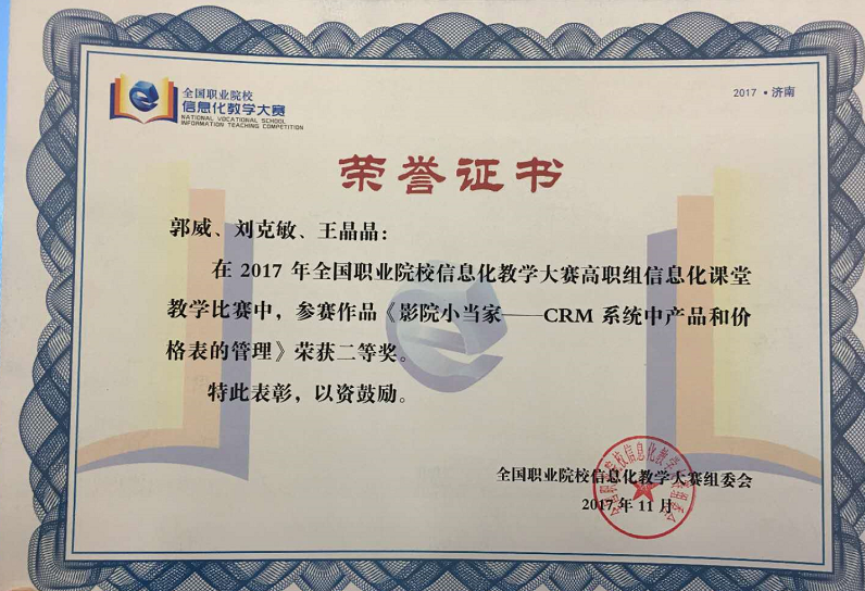 全国信息化教学大赛旨在提高教师教育技术应用能力和信息化教学水平,促进信息技术在教育教学中的广泛应用。本次大赛共收到来自全国共计36个参赛队4114名参赛教师的1587件参赛作品,作品及教师数量均创历史新高。最后,全国共有372件参赛作品入围现场决赛,分为信息化教学设计、信息化课堂教学、信息化实训教学三个比赛项目的比拼。其中我院郭威、刘克敏、王晶晶老师作品《影院小当家——CRM系统中产品和价格表的管理》,作为上海地区高职院校赛项唯一一个入围作品,参加的是高职组信息化课堂教学竞赛。