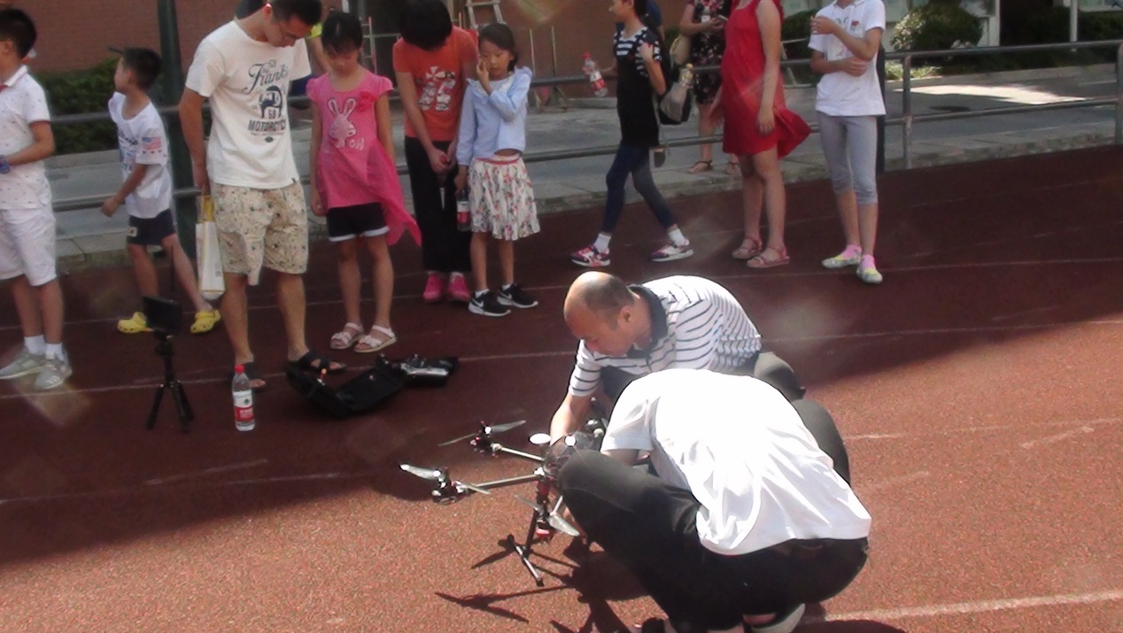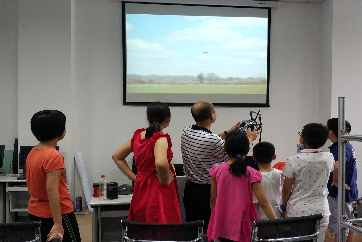 第二天,体验模块无人机操作受到体验者的热捧。指导老师详细介绍了无人机的原理、类型等以及我院师生如何自行组装六翼无人机,让体验者即了解无人机也为自己动手组装打下基础。同时,项目负责人演示了如何在仿真软件下操控无人机模拟飞行,让体验者一个个上来实际操作,并选拔两位优秀学员进行无人机实战飞行,体验者个个兴致高昂、争先巩后地参加。下午,在指导老师和志愿者的带领下,在体验者一片欢声雀跃中,由体验者操作无人机飞升上空。
