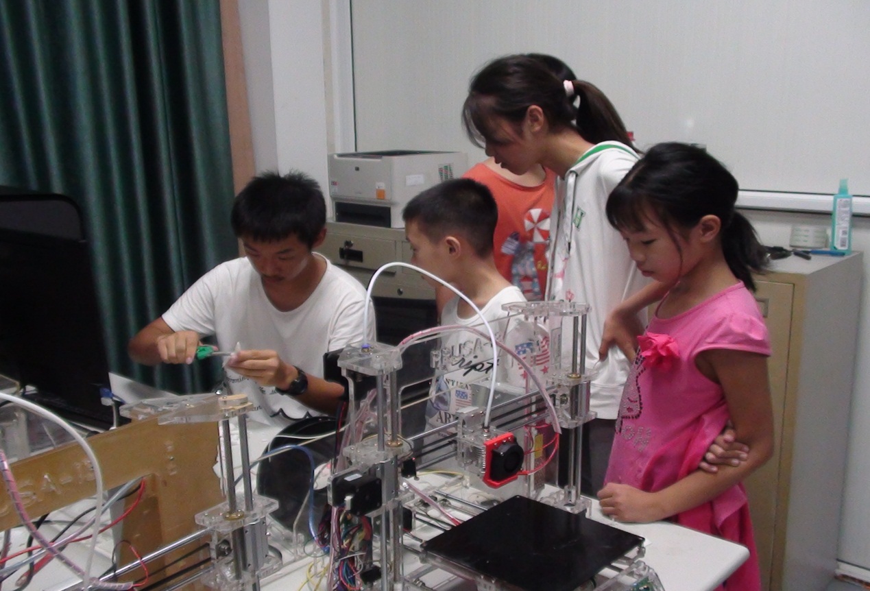 活动当天,院长董大奎、常务副院长韩芳亲临现场指导,并与体验者及家长展开了热烈交流,宣传了本次活动的意义和宗旨。指导老师以“什么叫机器人?什么叫工业机器人?”导入本次活动的主题,指出工业机器人是现代工业发展必不可少的巨大助力,在某种程度上可代替人进行高强度的重复性工作,同时将工业机器人和日常生活联系在一起,编写骑马程序,可以上下颠簸,如骏马奔驰一般。他还介绍了3D打印机的原理及操作方式等,让体验者亲手打印3D模型并为它们上色,让他们在玩耍中学习,在体验中学习,激发了他们的学习兴趣和学习热情。