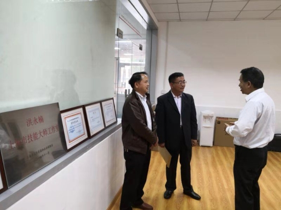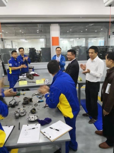 朱建新董事长一行参观了大师工作室,了解汽车维修技能大师洪永楠的工作情况,驻足观看了学生上课情况及校企合作项目车享家技师技能培训,在考察中,朱建新董事长对项目建设教师的辛勤付出表示感谢,对所取得的阶段性成果表示肯定,鼓励各位老师克服各种困难,确保今年高质量的完成创新发展行动计划项目。