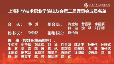 会议严格按照既定议程有序推进,审议通过校友会第二届理事会理事名单及《上海科学技术职业学院校友会章程》,选举韩芳为会长,许金如、曾喜平、李星辰、陈波、沈琴、刘子晴为副会长,张仲铭为秘书长,滕怡洁为副秘书长。
