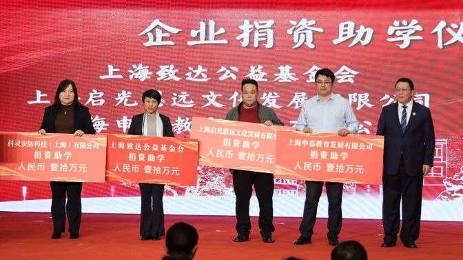 在捐资助学仪式环节,上海致达公益基金会、上海启光思远文化发展有限公司、上海申嘉教育发展有限公司、科灵安防科技(上海)有限公司分别向学校捐赠10万元,学校党委副书记、常务副院长许金如代表学校接受捐赠。