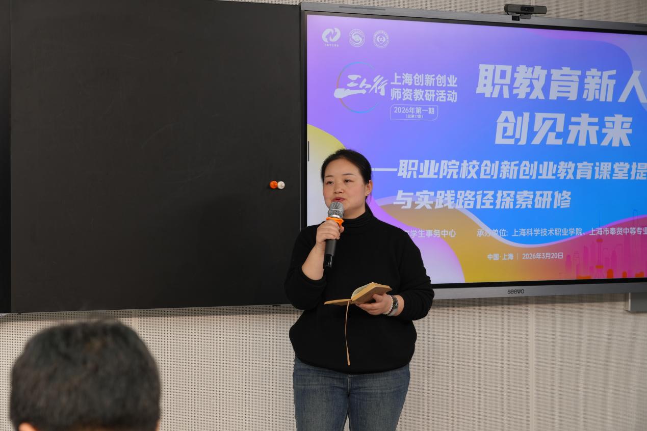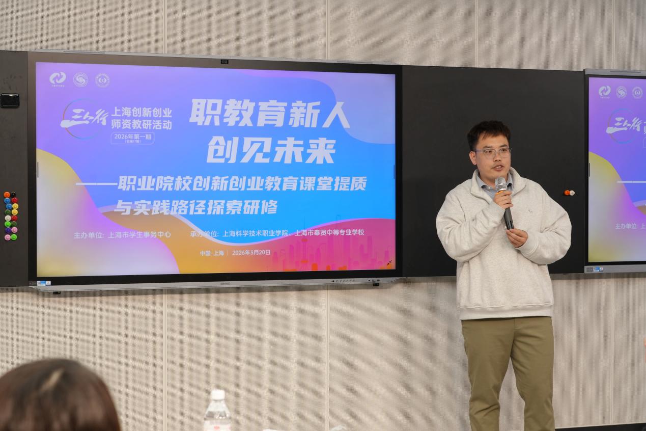 为深入推进职业院校创新创业教育改革,提升课堂教学质量与实践育人水平,2026年,由上海市学生事务中心主办,上海科学技术职业学院、上海市奉贤中等专业学校联合承办的“三人行”上海创新创业师资教研活动2026年第一期(总第17期)在上海科学技术职业学院顺利举行。本次活动以“职教育新人·创见未来”为主题,汇聚全市职业院校创新创业教育领域骨干教师、行业专家共同交流研讨。