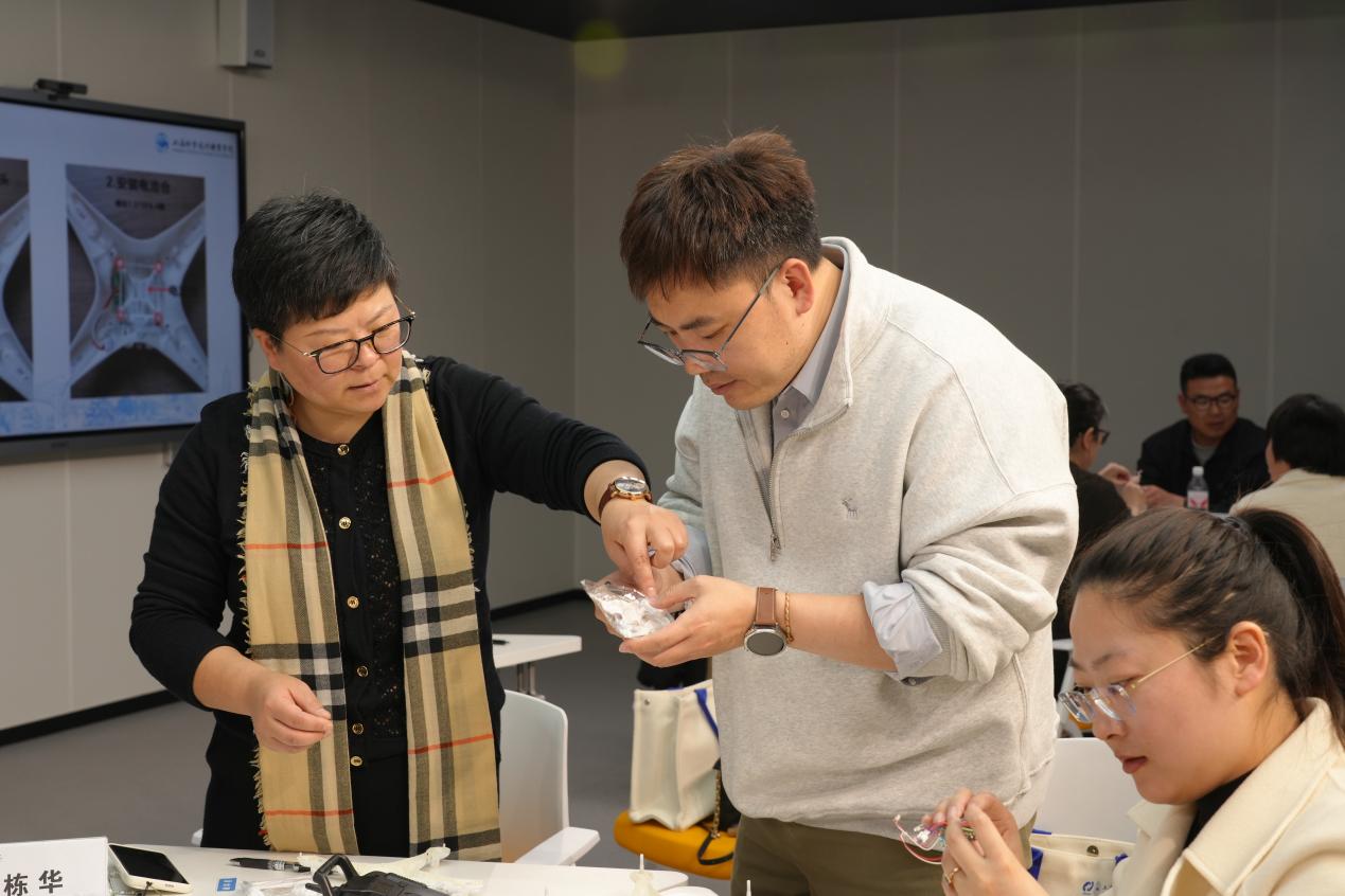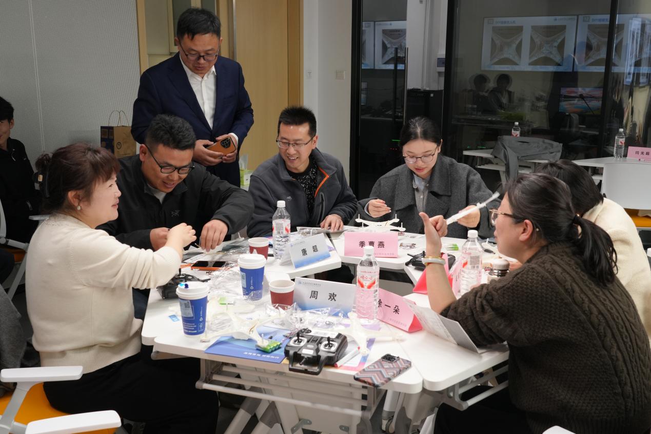 下午的实践工作坊与磨课工坊环节,将理论学习与动手实践深度结合,氛围热烈、成效显著。中国国际大学生创新大赛国赛银奖项目负责人、上海科学技术职业学院智能制造工程学院教师王凌开展「低空创想」无人机创新应用工作坊教研活动。王凌老师结合自身项目经验,系统讲解无人机创新应用场景、技术原理与教学转化方法,随后现场指导参会教师亲手组装、调试、制作无人机,让原本抽象的创新创业实践课变得可操作、可复制、可推广,帮助老师们快速掌握无人机创新课程的教学要点与实操技能。